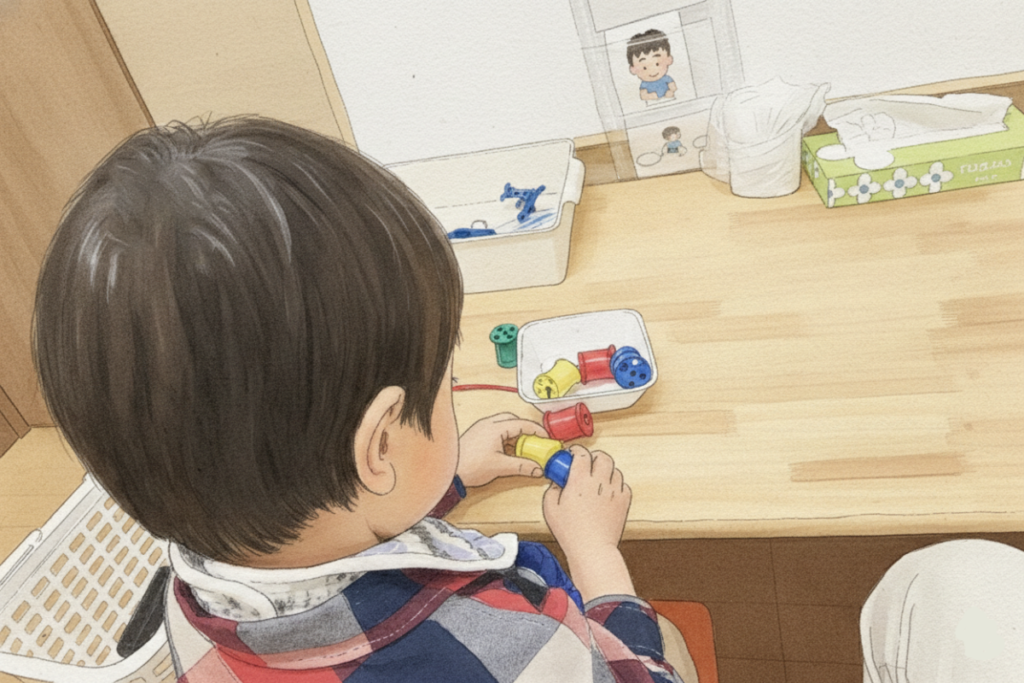 私たちは療育の中で、見本を提示して模倣してもらう場面も大事にしていますが、『自分で試行錯誤しながら取り組み、自ら発見したり、気づいたりする場面』も大切にしています。